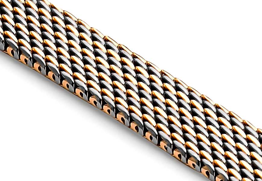 Il existe une technique unique, aux origines reculées que nous avons adoptée dans les années soixante-dix et qui nous permet de transformer l’or, le platine ou le titane-or en un tissu souple et flexible, donnant vie à de véritables jeux de mailles extrêmement fins et élégants.